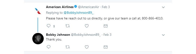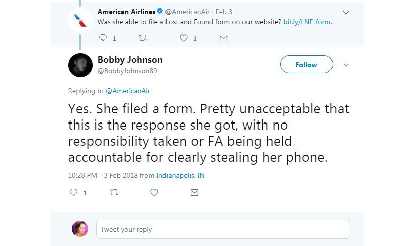 Después de que Johnson ofreciera una respuesta afirmativa, American Airlines sugirió que la pasajera se presentara en sus instalaciones o llamara para explicar las circunstancias de su caso.