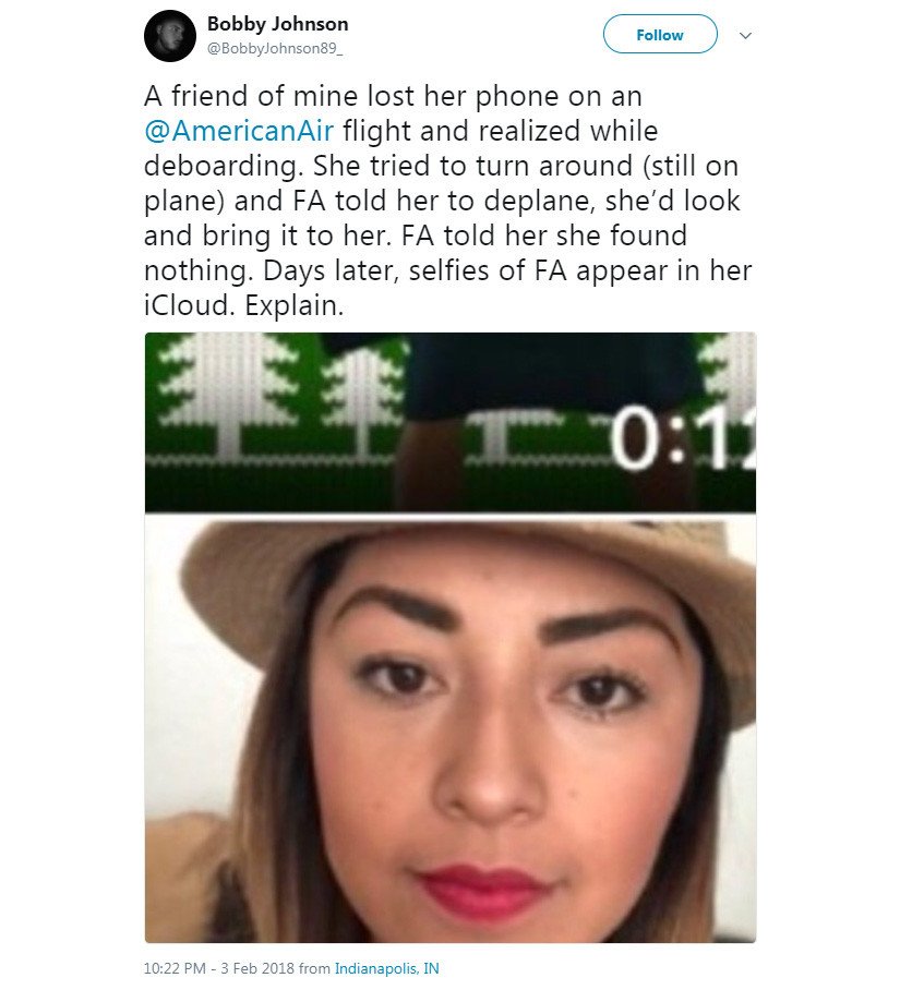 Una mujer olvidó su iPhone en un avión de American Airlines y los trabajadores de esa compañía aérea le comunicaron que no lo habían encontrado a bordo pero, al cabo de los días, vio en su cuenta de iCloud los selfis que una azafata se había hecho con su celular, informa The Sun.