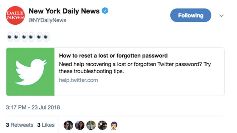 Más tarde, la cuenta del New York Daily News publicó otro tuit con el enlace a la página de ayuda Twitter donde se explica cómo restablecer una contraseña perdida u olvidada, acompañado de varios emoticonos de ojos.