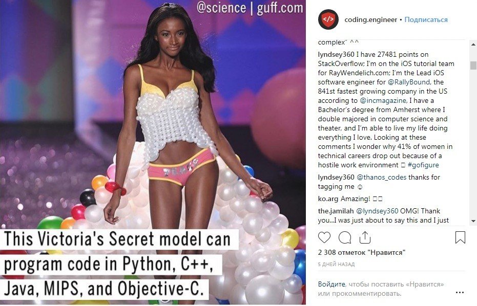 La semana pasada, la cuenta de Coding Engineer en Instagram publicó un 'post' con la fotografía de Scott acompañada de un mensaje que decía: "esta modelo de Victoria's Secret sabe programar en Python, C++, Java, MIPS y Objective-C".