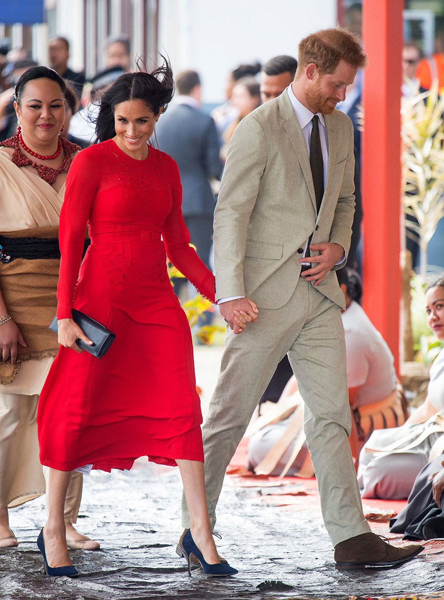 El príncipe Enrique y su esposa Meghan, duquesa de Sussex, están en medio de una gira oficial por Australia y Oceanía. Este 25 de octubre, la recién casada pareja real llegó al reino de Tongo. Megan, que lucía un elegante vestido escarlata, bajó del avión y caminó por la alfombra roja de la mano con su esposo, mientras los fotógrafos presentes captaban sus imágenes.