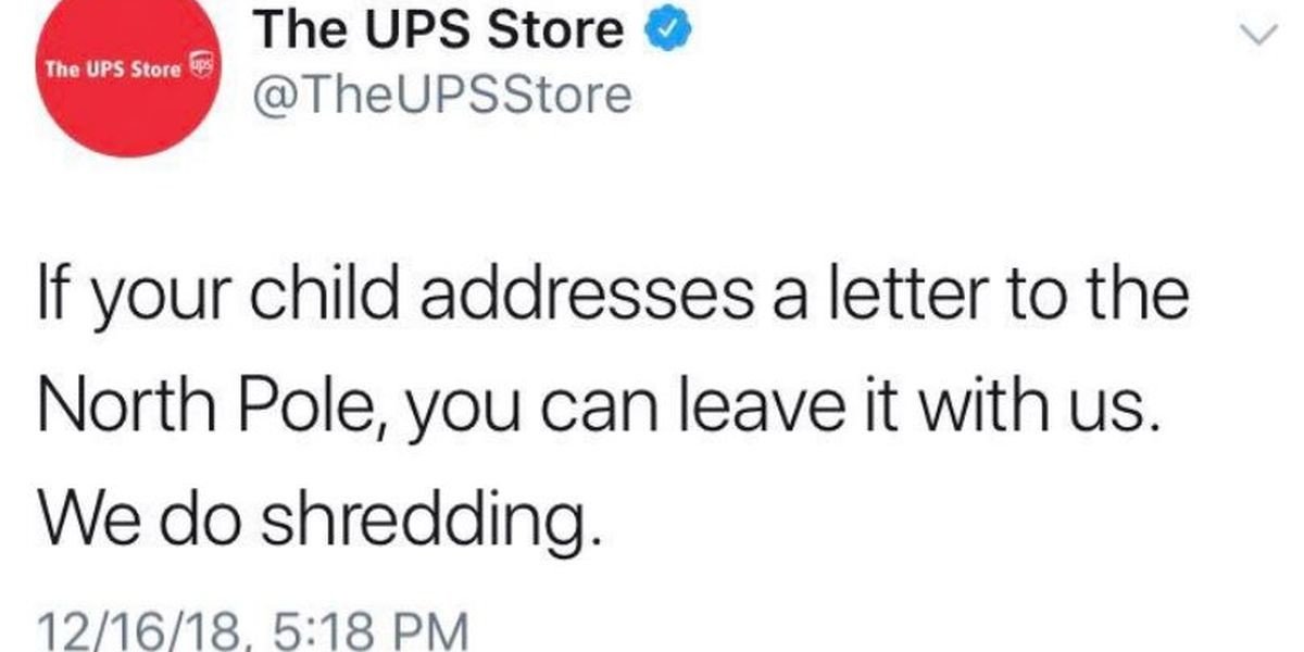 La empresa estadounidense de servicios postales e impresión UPS Store se vio obligada a eliminar un tuit en el que bromeaba con destruir cartas de niños dirigidas a Papá Noel después de que este generara una ola de reacciones negativas en las redes. La polémica se inició después de la compañía publicara: "Si su niño envía una carta al Polo Norte, puede dejarla con nosotros. Hacemos trituraciones".