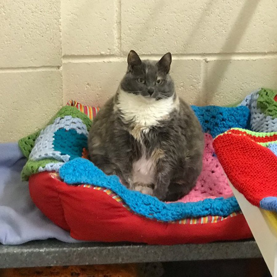 Los voluntarios del Fondo de Bienestar Animal Woodside que lo acogieron en mayo de 2017 creen que hasta entonces había vivido en distintos pisos de estudiantes, donde sus cuidadores la alimentaban de manera incorrecta. Mitzi, así se llama la gata, llegó a pesar 7,2 kilos, casi el doble del peso recomendado para gatos de su edad, 8 años.