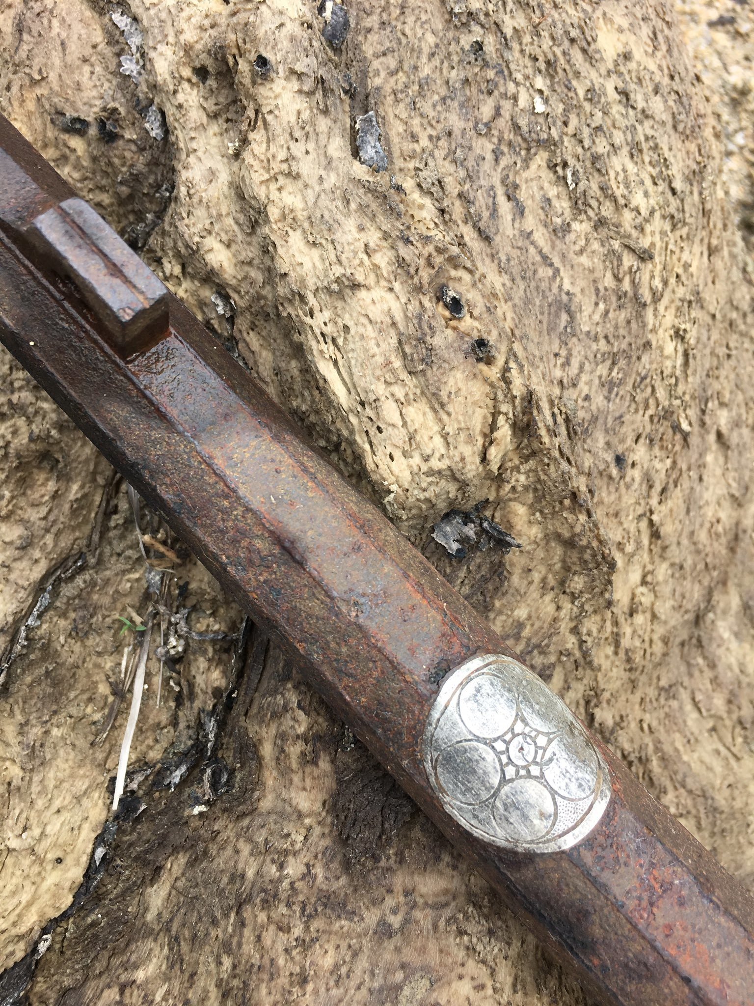 El arma cuenta con una inscripción y un 'mon' —emblema de un clan familiar— que podrían arrojar luz sobre su origen.