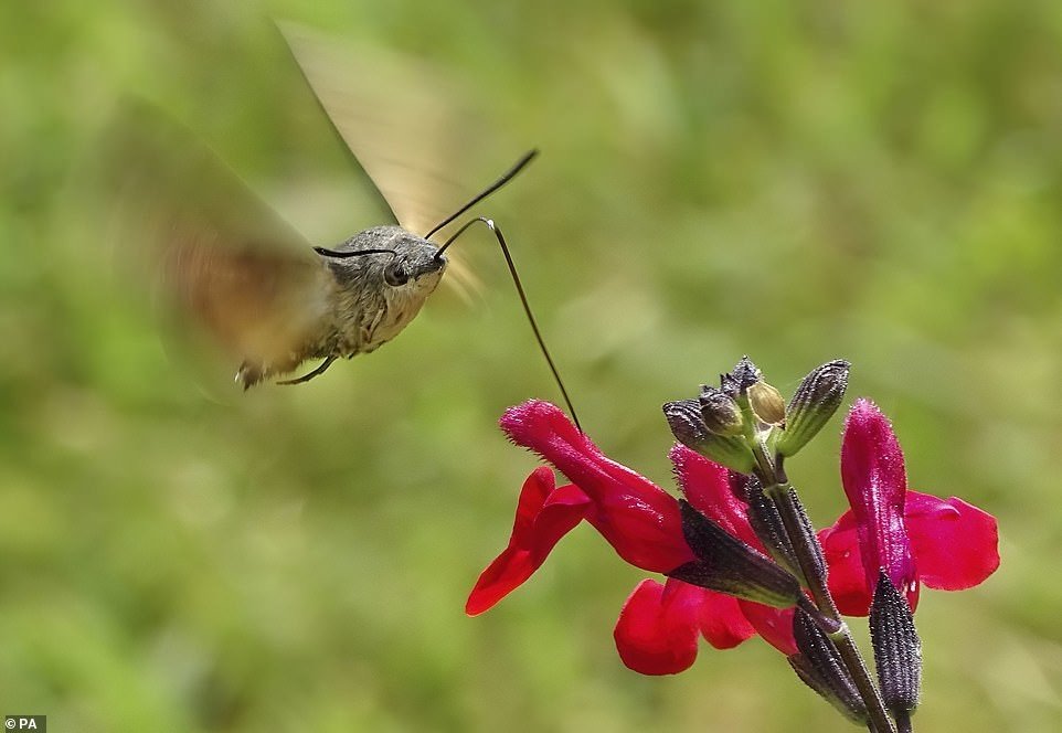 Thomas Easterbrook, un niño británico de 10 años, captó esta mariposa esfinge colibrí mientras chupa el néctar de una flor.