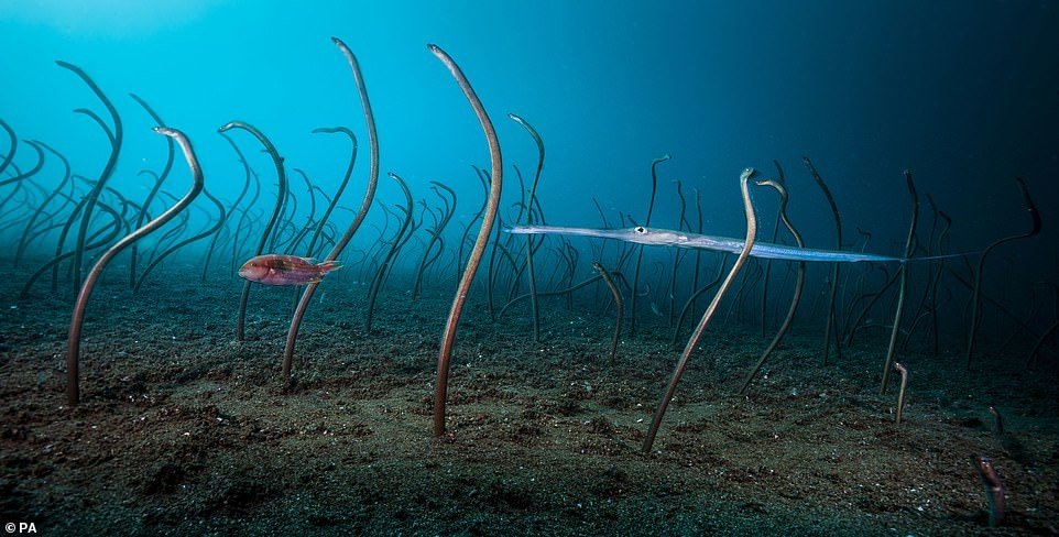En esta otra imagen, el estadounidense David Doubilet se aprecia una colonia de anguilas de jardín. Para obtener esta foto, tuvo que instalar una cámara, esconderse debajo un escombro de naufragio y activar el sistema de forma remota.