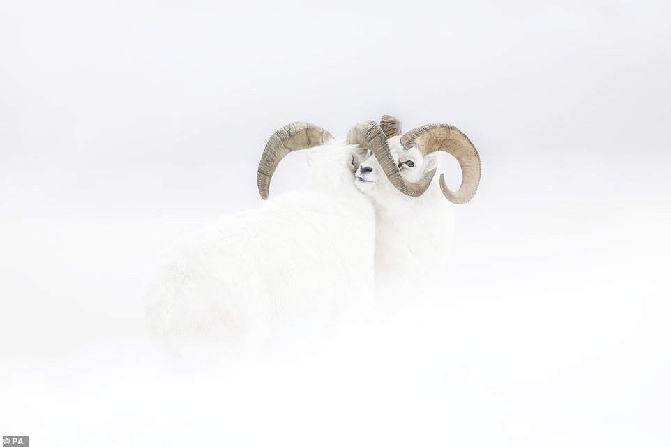 En esta otra imagen dos carneros o muflones de Dall hacen una pausa durante su enfrentamiento en un paisaje montañoso totalmente blanco. Su autor es el francés Jérémie Villet.