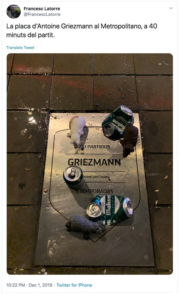 Antes del partido, aficionados 'rojiblancos' vandalizaron la placa instalada en honor al jugador francés en las inmediaciones del Wanda Metropolitano, colocando sobre ella ratas de peluche, latas vacías de cerveza, entre otros objetos, mientras otros hinchas coreaban cánticos de "Griezmann muérete".