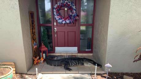 Una familia de Florida encontró el pasado 30 de junio a un caimán de 2,6 metros de largo en la puerta de su casa. Pese a sus intentos por moverlo, no consiguieron que abandonara el lugar, porque lo que tuvieron que recurrir a la ayuda de los especialistas de Croc Encounters para retirar al peligroso reptil, informa esta organización en su cuenta de Facebook.