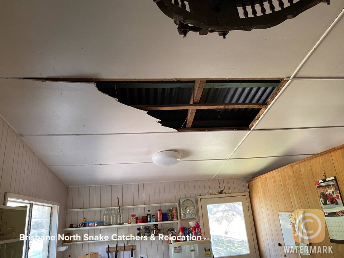 Un residente de la localidad de Laceys Creek (Queensland, Australia) descubrió un agujero en el techo de su cocina al regresar a casa este lunes. Como no había habido ninguna tormenta en los días anteriores, el hombre empezó a buscar lo que pudo haber causado el daño y encontró en el suelo de la vivienda a las responsables: dos pitones de gran tamaño.
