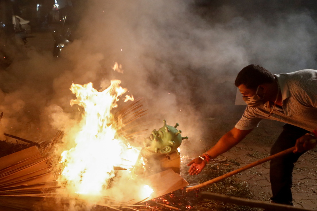 Durante las celebraciones por el inicio del nuevo año, habitantes de la ciudad india de Bombay recibieron al 2021 quemando sobre una pila de fibras naturales un muñeco de color verde con una cabeza en forma del coronavirus que provoca el covid-19. El coronavirus ha infectado en la India a más de 10 millones de personas y ha cobrado la vida de al menos 148.000, convirtiéndola en el segundo país más afectado por la pandemia a nivel mundial.