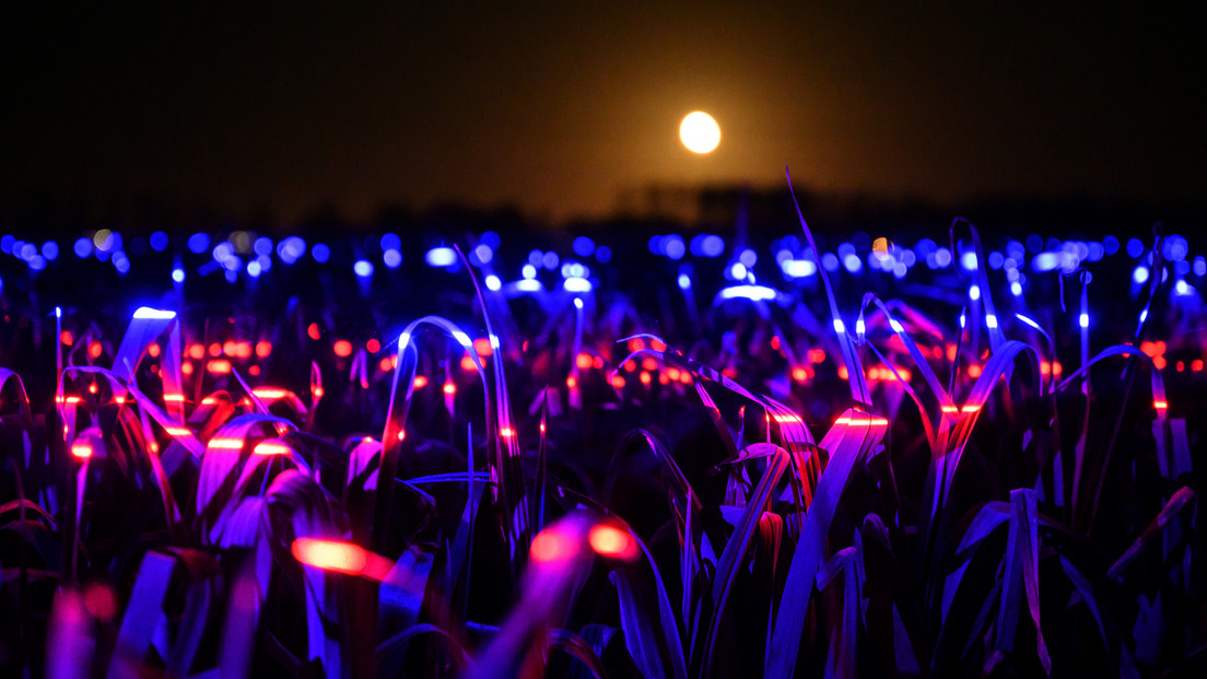El artista hizo uso de "las tecnologías de la ciencia de la luz de la fotobiología, que han demostrado que ciertas intensidades de luz azul, roja y ultravioleta pueden mejorar el crecimiento de las plantas y reducir el uso de pesticidas hasta en un 50 %".