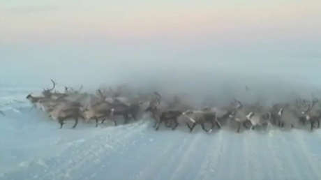Una manada de renos sorprendió a un hombre que conducía por una carretera nevada en la aldea de Novy Port, en la península de Yamal (Rusia). Los animales corrían hacía su coche y le obligaron a detenerse.