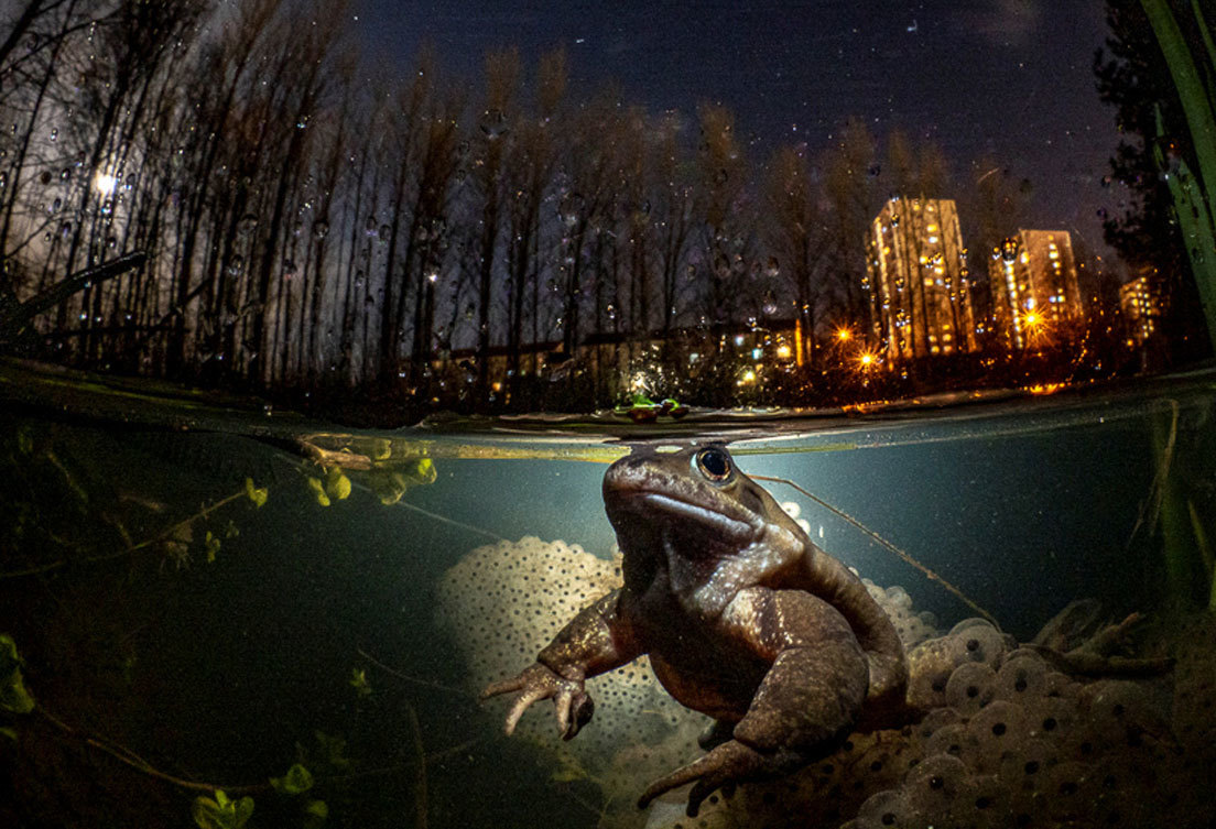 La categoría Mi Patio Trasero y Gran Angular en Aguas Británicas fue otorgado a Mark Kirkland por la fotografía 'While you sleep' (Mientras duermes), que muestra a un pequeño sapo posando sobre un estanque lodoso en un bosque de Glasgow (Escocia).