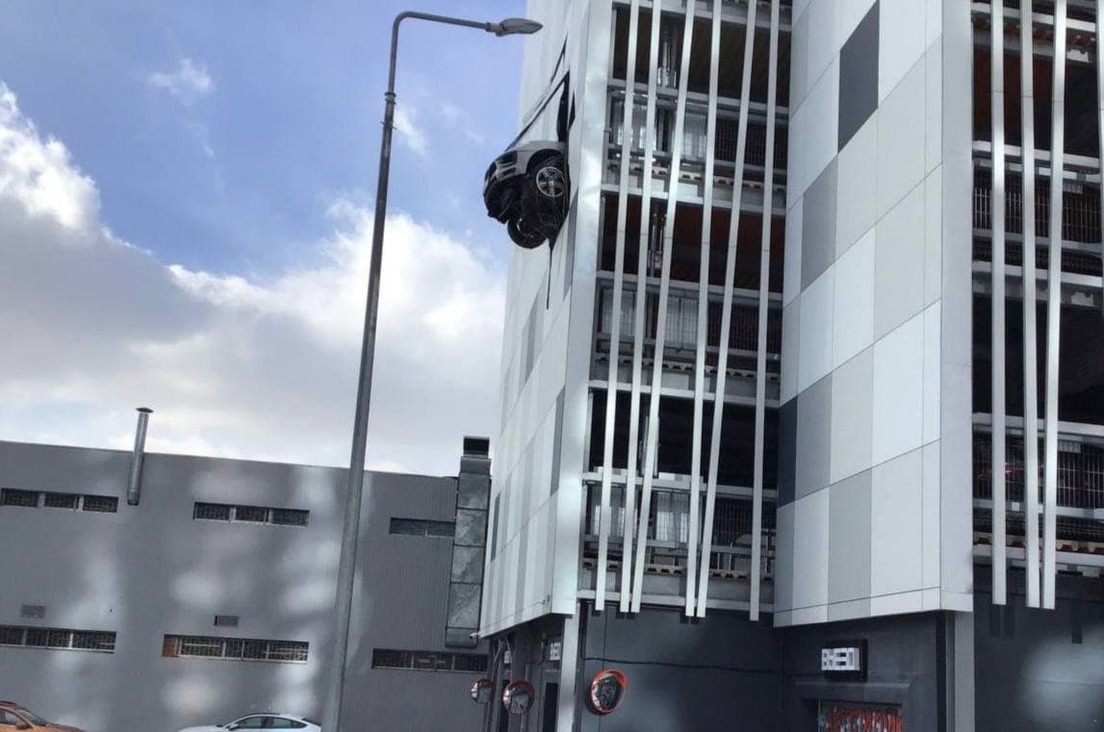 Un Porsche atraviesa la pared de un 'parking' a varios pisos de altura y queda colgado en el aireEl vehículo pertenece al jugador ruso de hockey sobre hielo Denís Kazionov, quien se encontraba en el coche junto con su familia. Por suerte, nadie resultó herido. pic.twitter.com/YpmkJP146Y