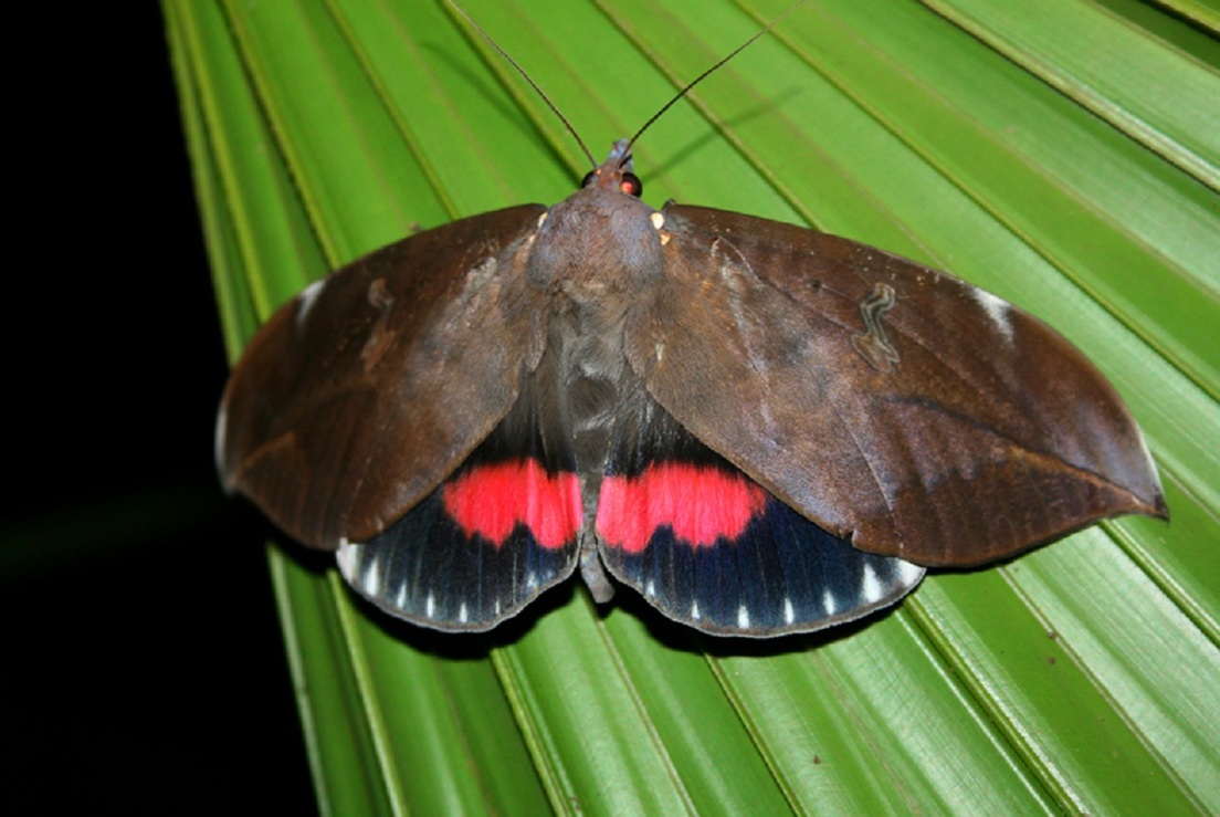 Cuando son adultas estas polillas miden entre 13 y 17 centímetros de envergadura, lo que las convierte en uno de los insectos más grandes del área. Viven tan solo 30 días, durante los cuales se nutren del jugo de frutas podridas o demasiado maduras. Aunque disponen de un camuflaje excelente que hace que los depredadores las confundas con hojas secas, también tienen un patrón para ahuyentar a sus enemigos. En el caso de los especímenes adultos, se trata de dos manchas rosadas y unas motas blancas sobre un fondo negro.