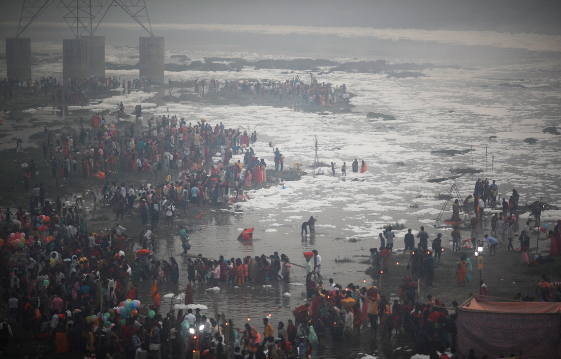 Una capa de espuma tóxica cubría las orillas y buena parte del sagrado río Yamuna, cerca la capital india, Nueva Delhi, cuando multitudes de hindúes se reunieron allí este miércoles para celebrar la fiesta religiosa de Chhath Puja.